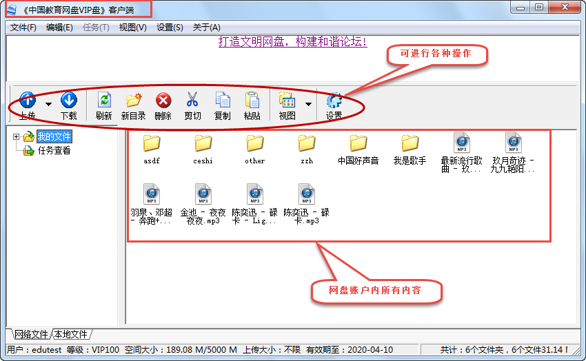 登录网盘后即可如同WEB打开网盘一样,可进行各种操作。