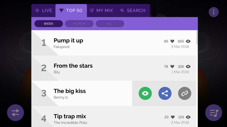 随意在6个版本之间切换,个性化的制作,创作属于你自己节奏乐感的Hip-hop,pop,电音或者巴西音。录制并和全世界玩家分享你的创作!如果获得足够的票数,你的混音作品就会出现在节奏人生游戏 Top 50排行榜里。