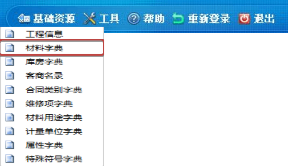 3.点击界面上方“基础资源区”在下拉框中选择“材料字典”?,界面左侧为“材料类别”,右侧看到为“材料信息”