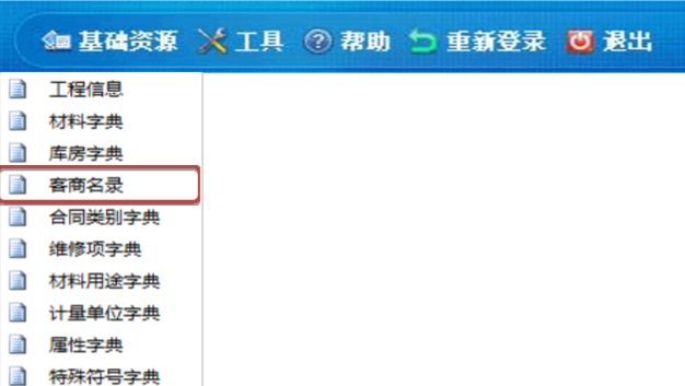 4.点击”基础资源”下拉框选择“客商名录”?,左侧为客户类别:其中划分为建设单位?施工单位?监理单位等,如需要新增,可以通过【新增类别】功能,在软件中添加新的客商类别。