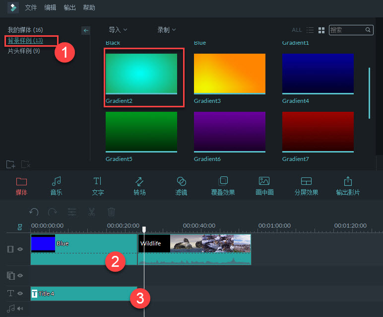 3、进入媒体库,选择背景色模板,将所选的背景色添加到时间轴的开头或指定位置。进入文字选项,添加文字模板并应用,调整背景色及文字的持续播放时间