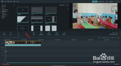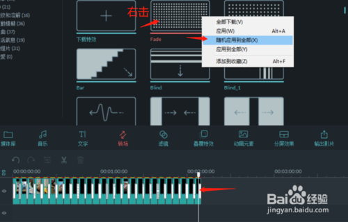 4、现在我们给照片加转场动画,一张张肯定很麻烦的,不过有个简单的方法,首先进入转场界面,你会看到有很多转场效果。随便右击一个转场动画,选择随机应用到全部。完成后我们就可以在视频轨道上看到我们的照片已经加上了转场动画。你也可以在预览框中预览一下加好转场的图片。