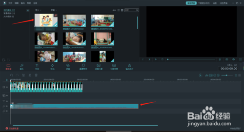 3、我们添加视频至媒体库列表后,我们将其拖动至下方视频时间轴中。
