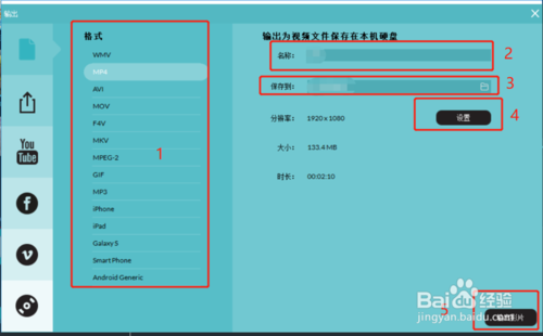 3. 将工程编辑完毕后,点击输出,选择输出的格式(格式最好与原视频相同)。选择设置,将输出时的分辨率、帧率和码率调至与原视频一致。