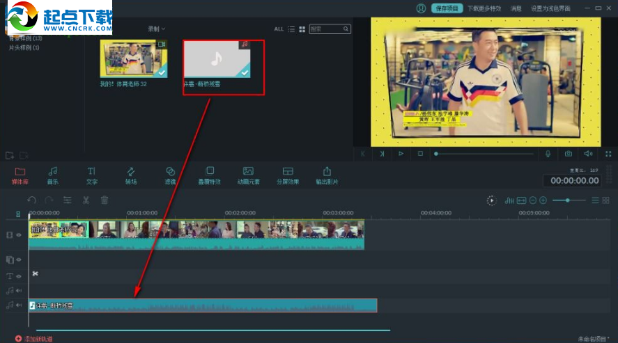 9、若用户需要将本地音乐作为背景音乐,可以直接在媒体库中导入音乐文件,然后拖动文件到音轨时间轴上,设置完成后我们进行导出即可。
