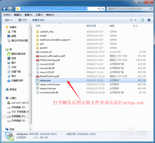 3、接下来就是安装软件了,打开刚才解压出来的安装包(PTC.Creo.5.0.F000.Win64)找到setup.exe安装程序双击进行安装!