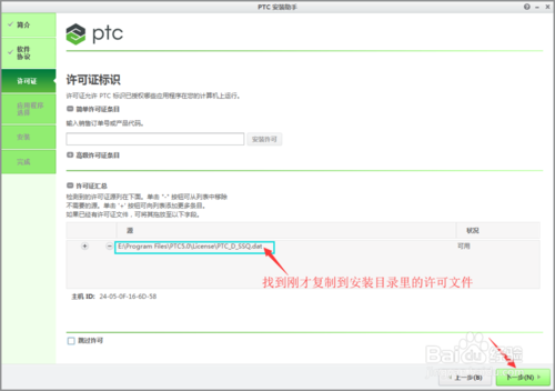 6、弹出软件许可证界面,在许可证汇总里面打开第二步复制到安装目录里面的那个许可文件E:\Program Files\PTC5.0\License\PTC_D_SSQ.dat然后点击下一步。