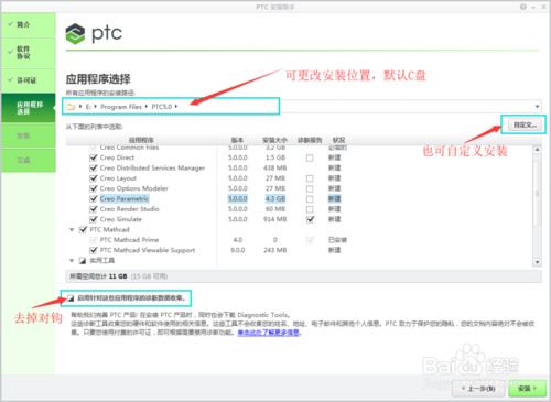 7、在弹出的应用程序选择界面中选择自己需要安装的程序和安装位置然后点击下一步,初学者建议选择默认安装即可也可自定义安装。注意:记得取消启用针对这些应用程序的诊断数据收集前面的对钩