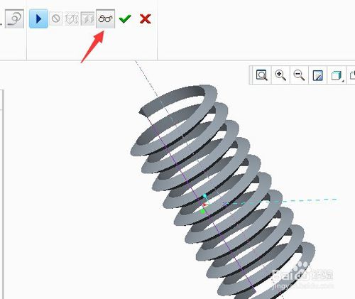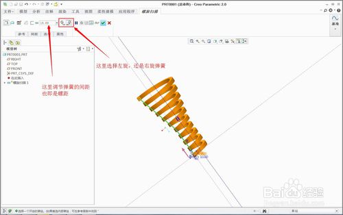 8、点确定后,如果你画的截面高度比螺距小,将会出现弹簧的预览图。可以设置弹簧的间距参数,间距一定要大于截面高度才能生成弹簧。可以设置左右旋弹簧,默认是右旋弹簧。