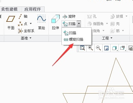 1、我们先认识一下这个“螺旋扫描”命令,先用这个命令直接做一个螺旋上升的一个实体。首先我们先找到这个命令,点击打开,进入螺旋扫描命令。