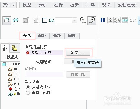 3、进入到螺旋扫描的操作界面,点开参考菜单,按下图指示点击定义,选择一个基准面作为绘图平面,其它默认设置。