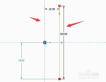 3、在草绘当中,先画一条中心,大家都知道,在执行旋转命令时,都是要有参照中心线,这个螺旋扫描也不例外,然后在画一条线,尺寸如图所示:然后点击完成草绘。
