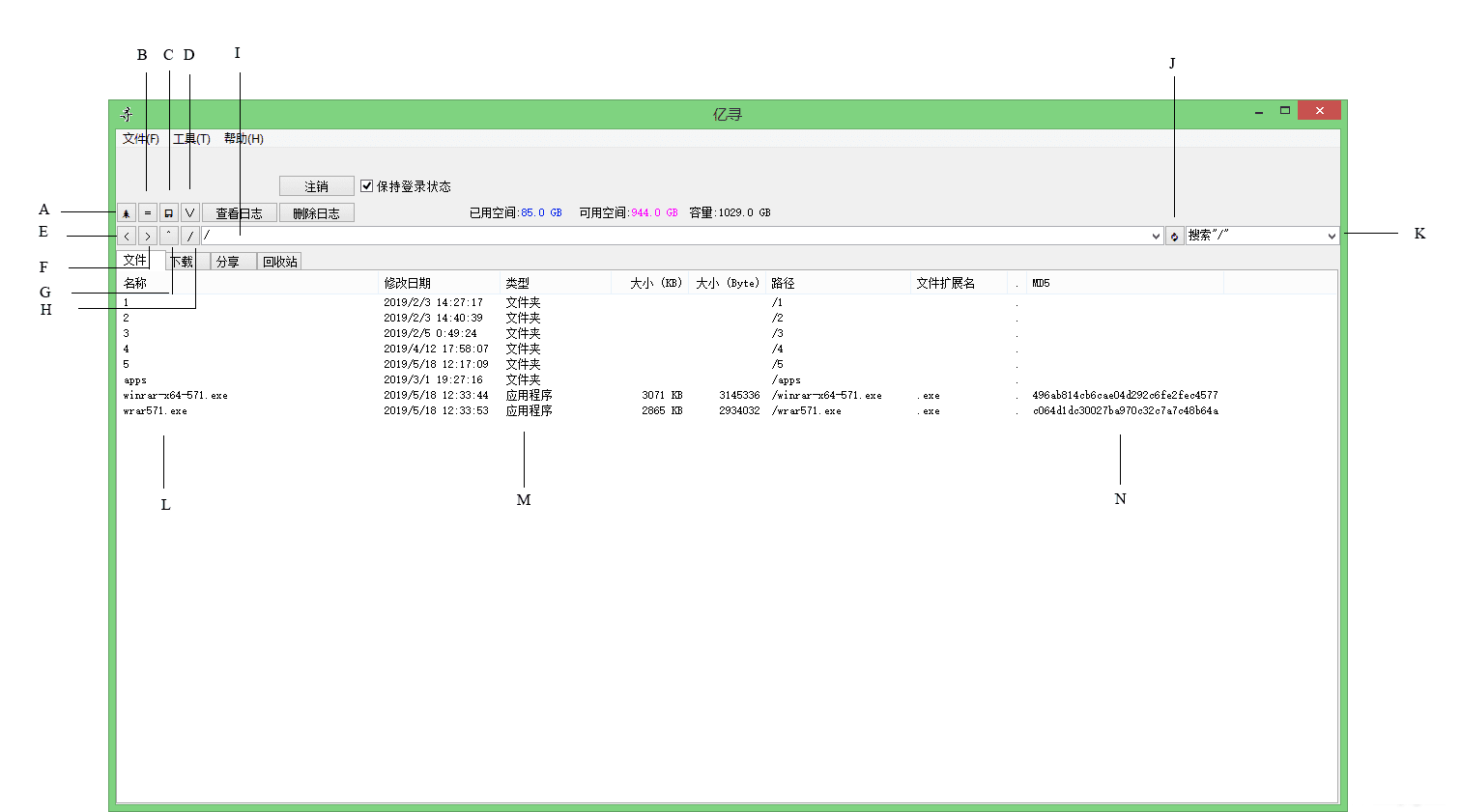 搜索 - 在 图1 所示的 K 搜索框中输入关键字,之后按回车键,会搜索当前目录及子目录下所有与列字段匹配的项,包括文件名、修改日期、类型、大小、路径、文件扩展名及MD5,只要一项匹配或部分匹配就视为匹配。