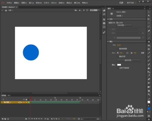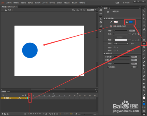 2、创建好文档后,在时间轴中选择第一帧,在工具栏中选择椭圆工具,设置一个颜色,在画布左侧绘制一个正圆形。