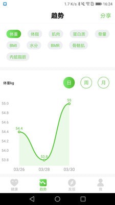 支持您身体多个指标按照日,周,月,年的方式进行曲线展示。