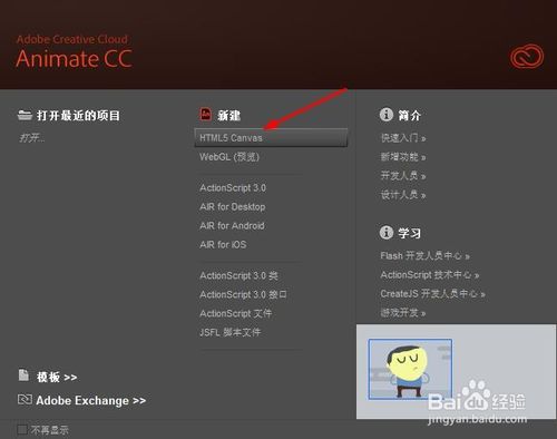 animate cc破解版如何新建一个HTML5?1、首先,我们启动Animate CC 2019,然后我们即可看到主页面。