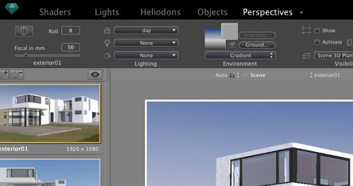 Artlantis提供两种照明方式:自动光线调节和ISO /快门。通过选择自动光线调整设置,场景中使用的灯光和霓虹灯功率会自动调整为适合天空和太阳照射。