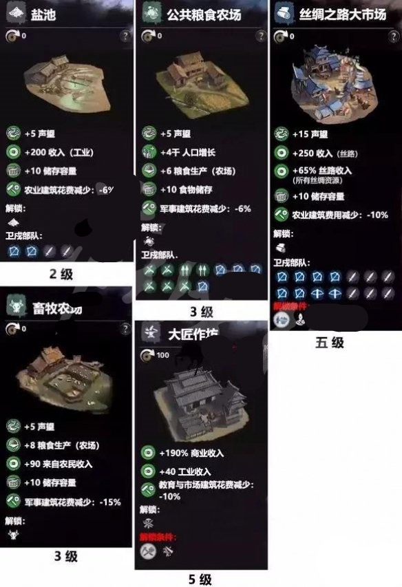 马腾的丝路(图为5级建筑):科技树有增加丝路收入(比如“丝路商队”+40%丝路收入),还有其他各种加商业buff;丝路的建筑+65%(有三个丝路资源点);马腾个人特性+100%丝路收入,官员增加等等。
