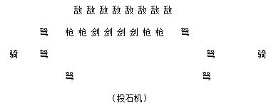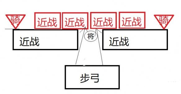 这是最基本最常见的布阵,图里的枪戟、剑、弓、骑图标应该一看就懂,三个蛋的是炮兵可以看做投石车。