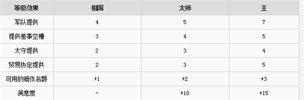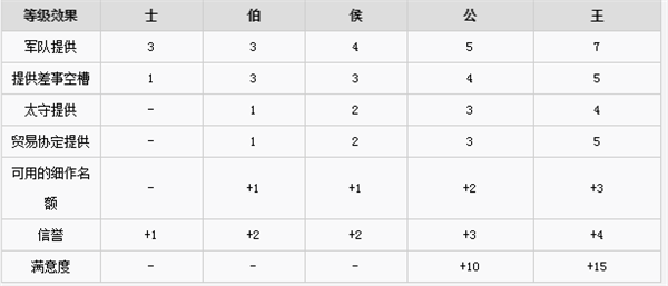 在战役模式中,玩家所在派系的初始声望等级为【士】。派系等级包括:士、伯、侯、公、王、皇帝,每升一个等级都会出现新的任务分配和更高等级的外交选项。