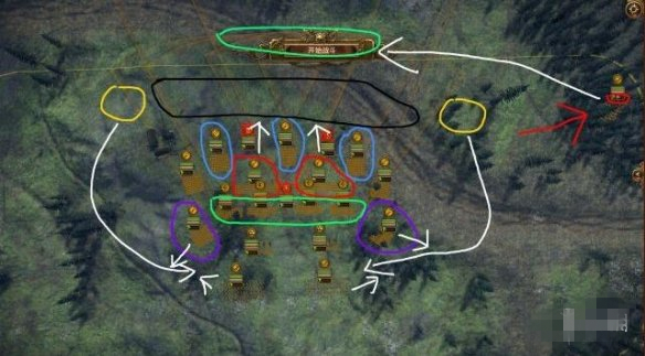 绿圈弓箭步放后排,前期能受到步兵保护不被敌人骑兵骚扰。紫圈侧翼两队枪兵防止对方骑兵绕后偷袭。阵地战一定记得关掉弓兵自动回避,必要时打开坚守以防止弓兵追逃时走出保护范围。