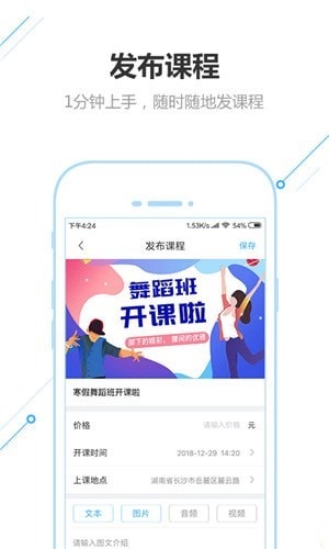 支持线下课程、活动、讲座、公开课等多形式课程的发布,还可自主设定推广佣金,实现全民分销。