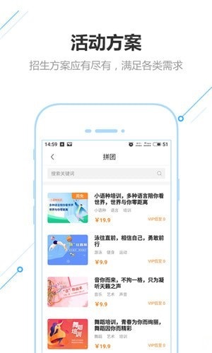 1、【拼团小程序】提供学校招生活动方案+拼团小程序工具,助力培训机构招生营销推广。
