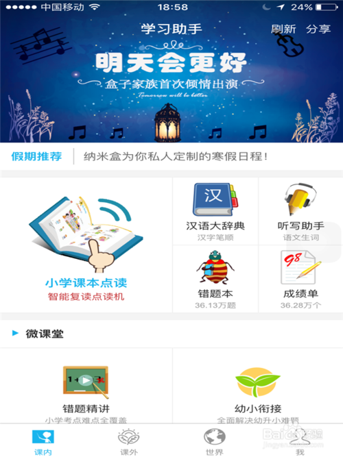 无论是纳米盒APP还是微信公众平台,屏幕下方都设置有课内课外的入口哦,点击进入就可以选择你想要看到的内容哦,真的非常简单啦!