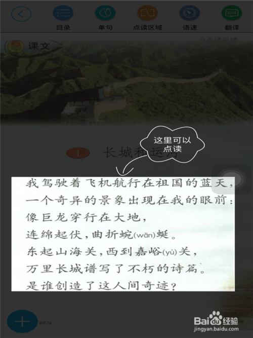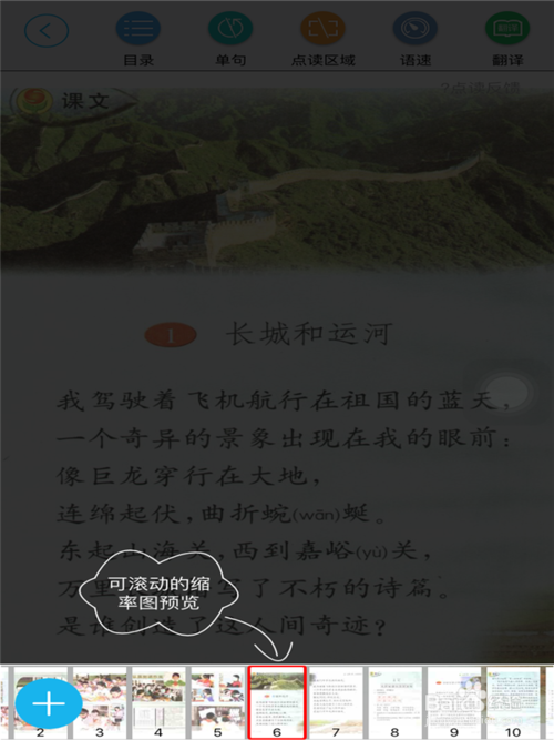 课本点读机手机上的智能点读机,点读内容覆盖全国小学教材,如人教、苏教、外研、北师大、语文社等等,点读课本随教材同步更新。支持语文、英语课本在线、离线点读,同时还支持复读、连读、单句循环、语速调节和专业英语翻译功能。此外,针对小学英语口语学习设计了练习环节,同步配套课本教材,口语考试语音测评引擎,评测精确到每个单词,维度评价口语标准。