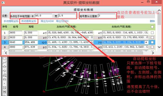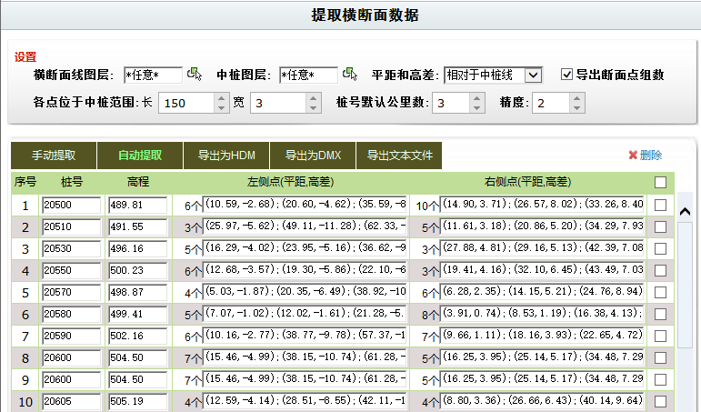 1.具有自动批量提取功能,框选横断面线,就能自动提取各断面的中桩、中桩号、高程、距离、左侧点和右侧点,全面提升了工作效率。2.对于复杂的断面,本软件还提供手动提取功能,确保数据正确。
