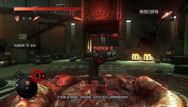 2、最后的战斗中A哥有四个阶段,第一阶段是使用刀刃做武器,玩家如果使用和他相同的武器攻对其是无效的,还会被A哥反击虐杀,所以玩家最好使用重锤、利爪做武器,加上卷须技能对付A哥,同时要注意抵挡。