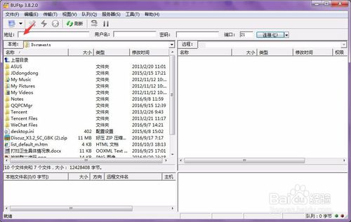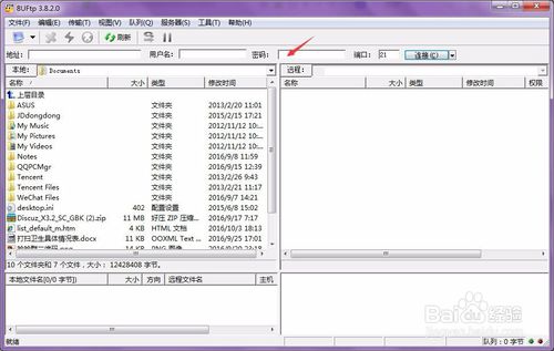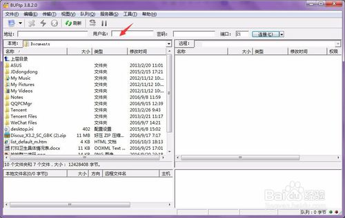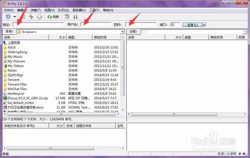 然后在桌面上打开你开始下载的8uftp,这里出现了三个需要填写的地方,分别是“地址”,“用户名”和“密码”(也就是图片上三个箭头指向的地方)