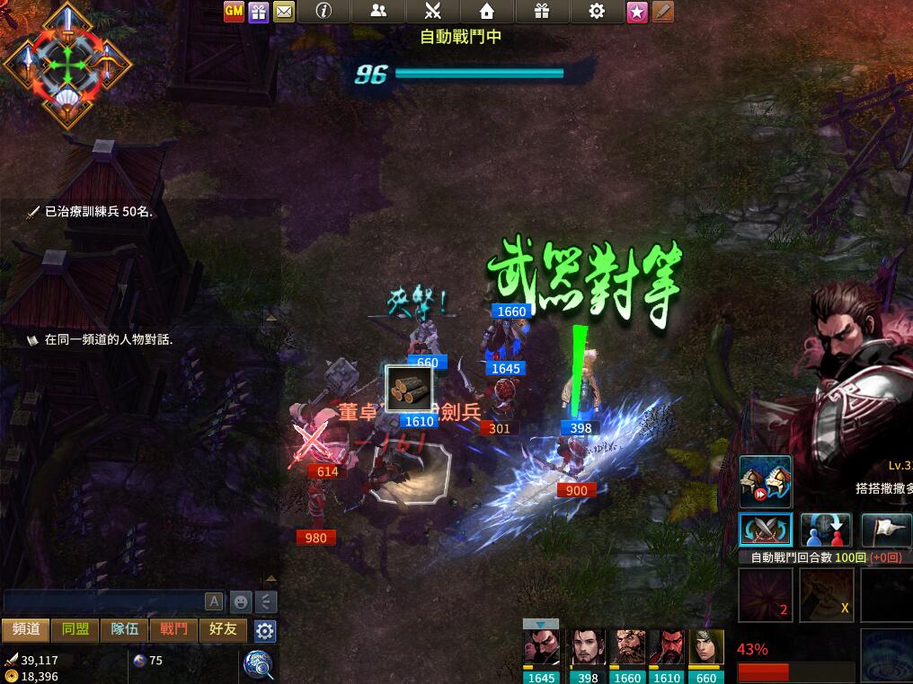 【武将云集自由对战】《胸怀三国》不仅还原了三国历史还结合了独特的「剧情动画语音」与超过1000 篇的丰富剧情,深刻描绘三国英雄的史诗故事,所有武将唯我所用,让玩家感受最真实的战争思维,彷佛置身于经典战役中,感受气势磅礡的完美战役。【调兵布阵震撼攻城】军营战、掠夺战、国战,施展武将调遣、战畧布局的雄才大略!真实还原还原三国史诗战役!《胸怀三国》中的副本挑战,让玩家透过组队更有效率的完成任务外,也可以与好友一同享受战斗乐趣,还可获得额外的组队点数奖励。玩家可组队参加3对3军营战副本,玩家在限定的时间内,运用战术策略和队友一起冲锋陷阵,突破敌方大本战。