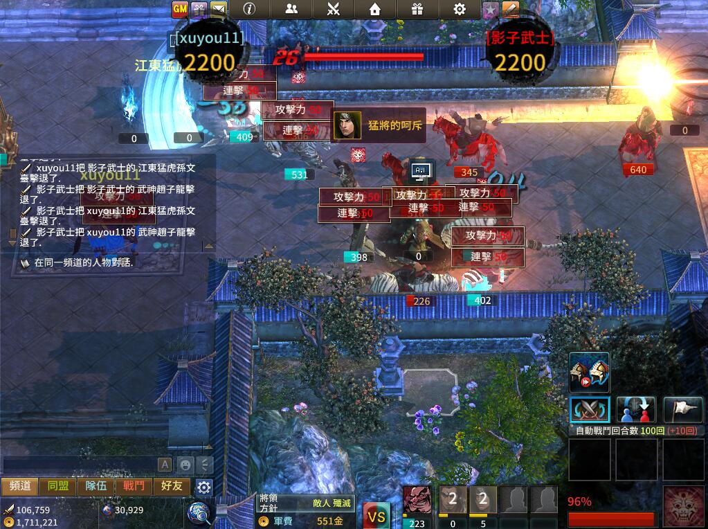 对战双方开战时都会显示相同的数字作为血量,开始自动战斗,玩家实时通过升级将领的策略技能等级来增强将领,并获得胜利,当一方对应血量的数字归0即表示战斗结束,另一方胜利。
