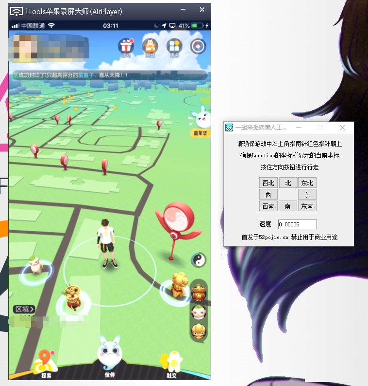 一起来捉妖懒人工具是一款针对最近非常火的AR手游一起来捉妖的辅助工具,它是由吾爱批量论坛网友分享提供的,使用这款软件保证不会被封号,并且可以通过键盘来操作,感兴趣的朋友快来下载试试吧,欢迎下载使用。之前论坛有大佬分享了一款ios用的虚拟定位软件Location,但是每次在电脑上修改坐标太累了,也不准确,所以我自己易语言写了个小工具,配合Location用来控制走路。