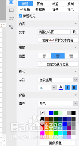 第四步,第三步预览的效果是使用默认的标题,这个标题没有表达图形的含义;返回设计器,修改标题内容,设置标题填充颜色,如下图所示: