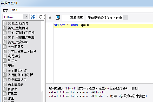第二步,利用报表工具新建数据库查询,使用自带的数据库表创建SQL语句查询,如下图所示: