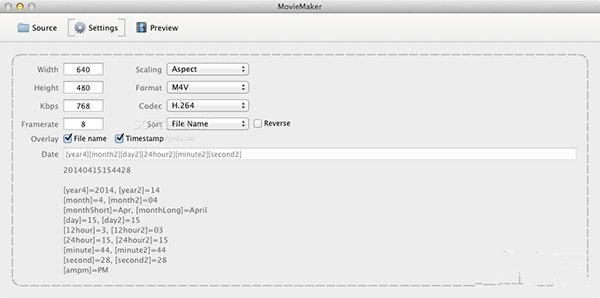 完全控制输出视频,在MovieMaker设置面板中,您可以调整视频的宽度和高度、帧率和图像质量。此外,您还可以选择在视频的左下角覆盖文件名和时间戳。其他定制选项包括可以调整图像缩放(Aspect、Aspect Fill、Resize或Fit)、输出文件格式(M4V、MOV或MP4)或用于视频的编解码器(H.264、MJPEG、PRO RES 442或PRO RES 4444)。