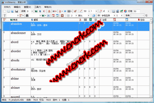 voltmemo法语分析能够把词库中所有的易错词和衍生词发掘出来。还能分析单词的词根。是最好的词汇分析工具。默认已经在筛选栏中提供了辅助的帮助项。直接使用就可以了。