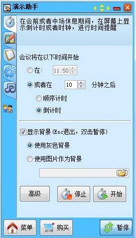 演示助手还能帮助会议的主持更为有效。在会议入场阶段,可在投影屏幕上显示倒计时或者时钟,进行时间提醒。所有要打开的程序或文件可事先配置好,会上即可快速打开,不再忙乱;所需的音乐文件可以事先配置在演示助手内,随时可以播放。