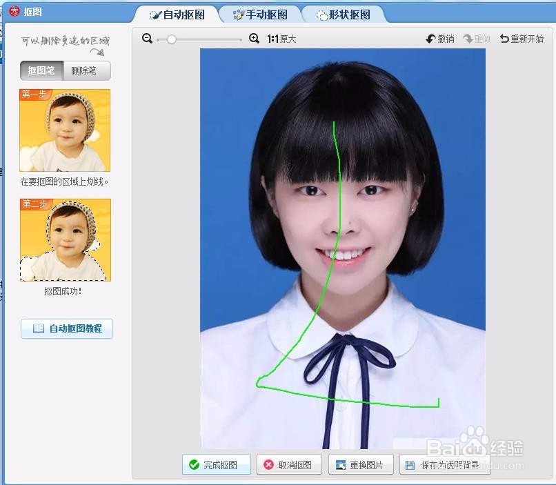 7、用户选择手动抠图选项后,使用“抠图笔”描绘所要抠图图像的轮廓,绘完之后,轮廓线上出现小圆点。如下图所示,就说明已经抠图完成了,用户也可以使用“反选”功能,可以选择你描绘的部分轮廓之外的图像,还有,如果不满意,还可以选择“重新抠图”按扭。