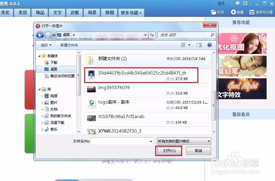 一、美图秀秀新版下载2019怎么去水印?1、首先在本站你下载安装好美图秀秀软件后,打开软件进入主界面,我需要将去水印的图片导入到软件中,点击界面右上方的打开选项,找到需要去水印的图片点击打开就可以将图片导入到美图秀秀软件进行操作了。