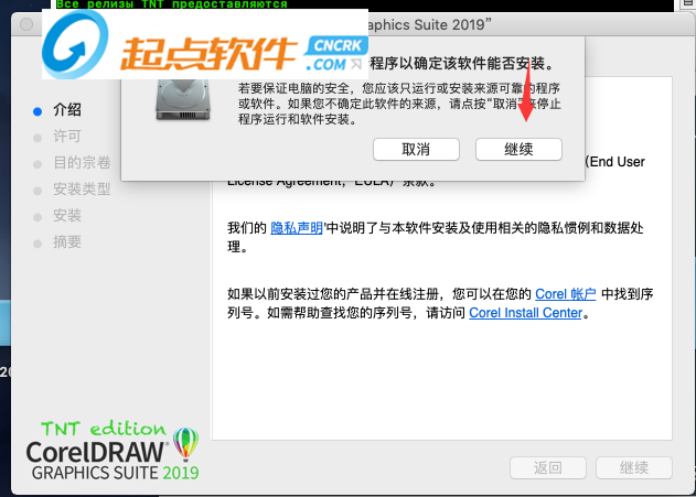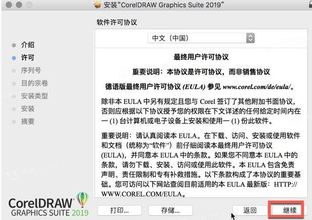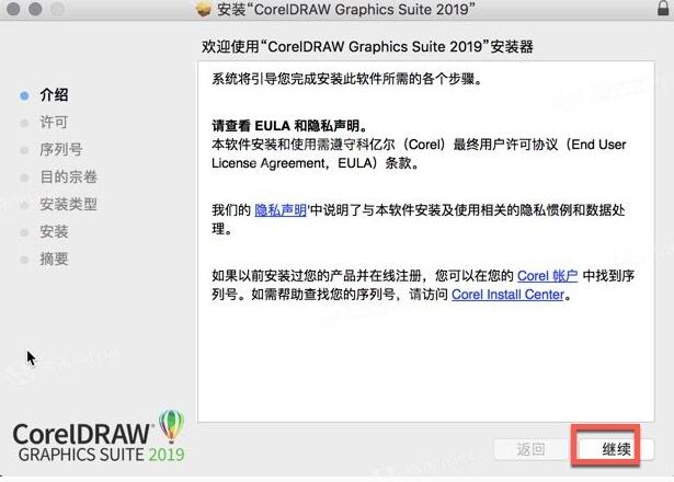 1、下载后双击软件的安装包进入到CorelDRAW 2019 Mac的安装向导