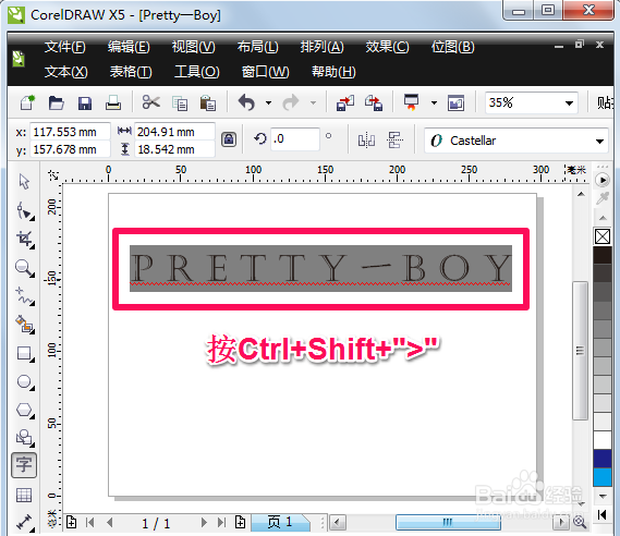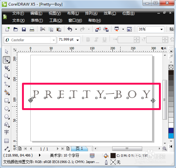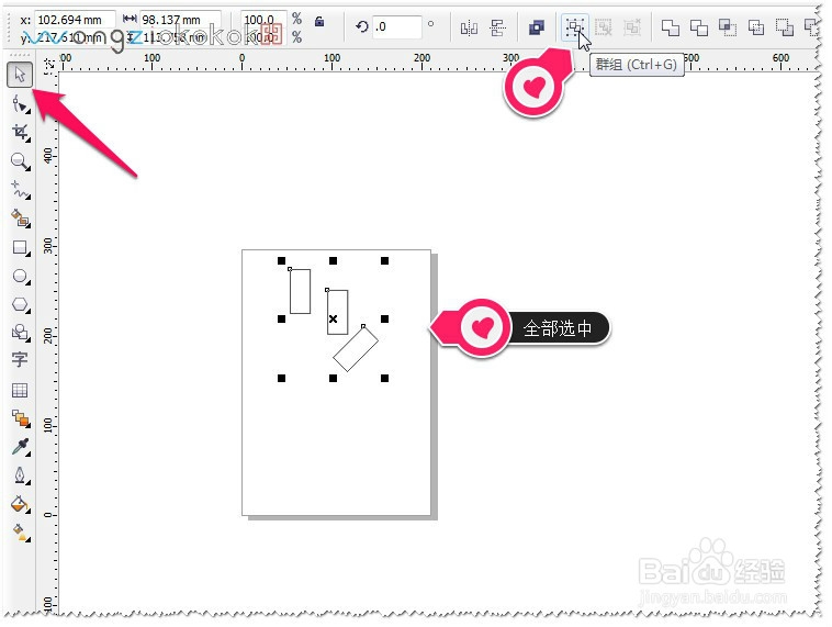 如果图案中有多个对象,要使图案不改变图形的效果在页面中居中显示。首先选中所有图形并群组(快捷键:CTRL+G),然后在键盘中按P即可。如图
