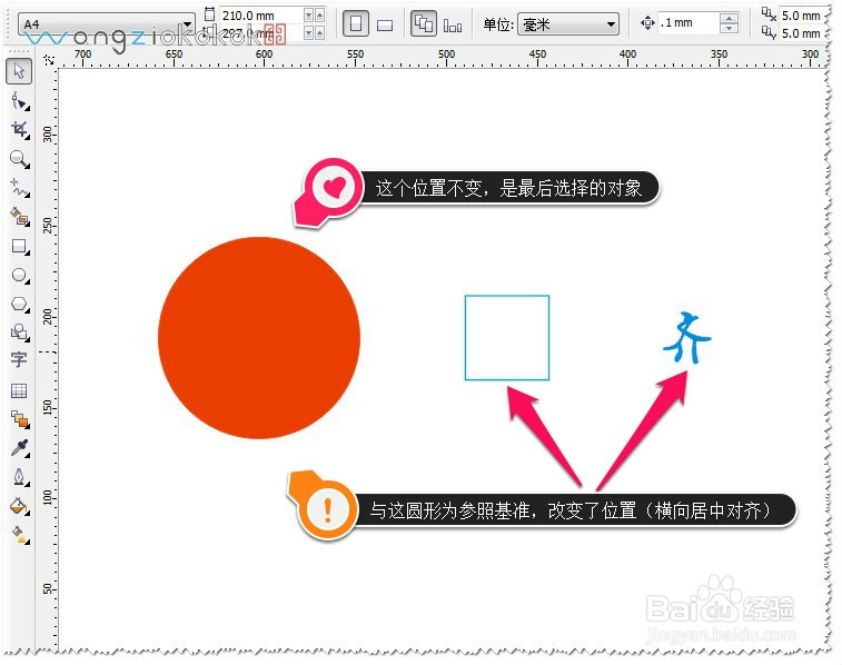 对齐时的选择顺序也是很关键的哦!!!最后选择的那个对象是参照基准的哦——所以最后选的那个对象是不改变位置的,其它的图形与最这个对象为参照基准而改变的。多多练习会发现规律的!!!如图