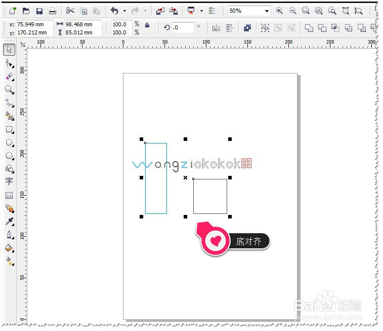 如果想让两个矩形,底边对齐怎么办呢?这个其它也很简单,在键盘中按B即可。B为底边对齐。如图