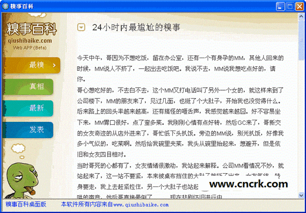 糗事百科客户端电脑版提供网络上最新最全的糗人糗事,有图片,有文字。包括的类型有各种精华,真相,穿越的糗事,让糗友们自由分享真实生活中遭遇到的尴尬事件,爆笑不止,每天15分钟,让你延长寿命0.99%!有了这款糗事百科客户端电脑版就可以不用进去网站直接打开方便一些网友,还不快下载!