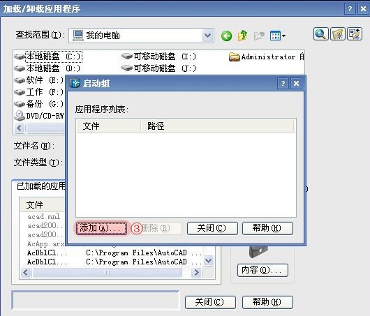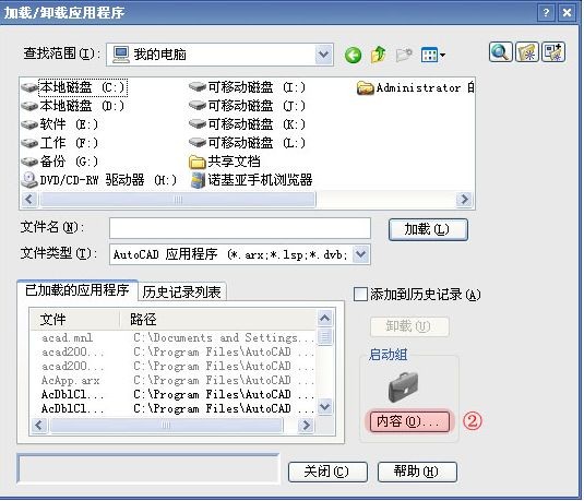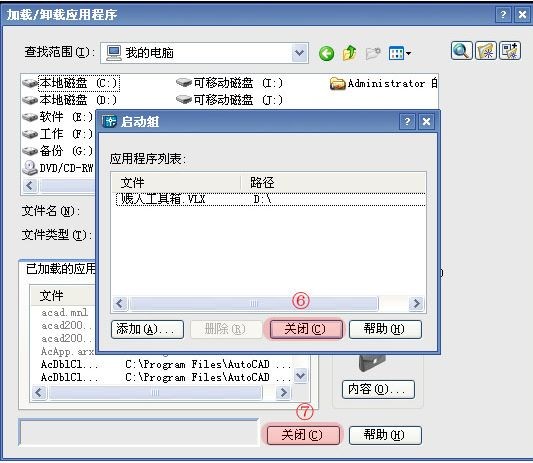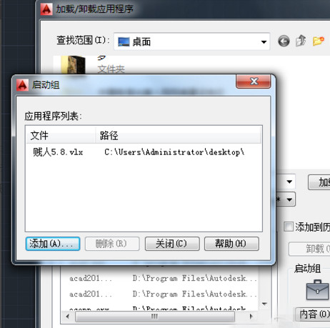 1、加载好后,只能单独使用,要想每次打开CAD都有这个加载程序,需要在启动组中也添加进去,在加载界面中点开“启动组”。同样把“贱人工具箱VLX”文件加载进去;