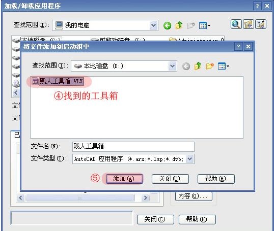 (4)再举一个例子,如果你的工具箱放在D盘123目录下,那这句话应改成(load "D:123贱人工具箱.vlx)