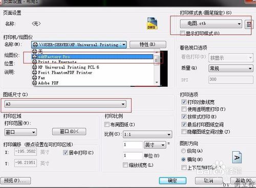 5、选择打印机pdfFactory PRO、打印样式、图纸尺寸后点确定。
